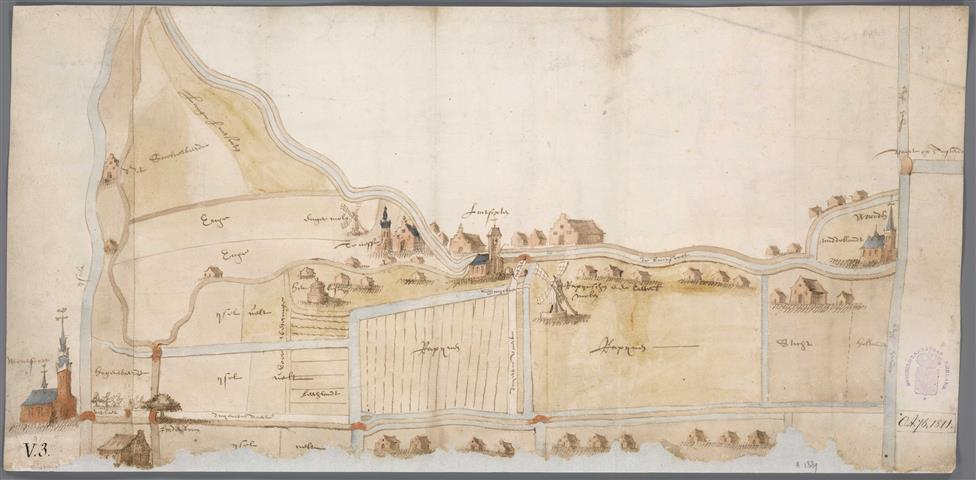 Een zeer mooie manuscriptkaart uit 1516 met daarop het gebied tussen Montfoort, aan de linkerkant en Woerden aan de rechterkant.